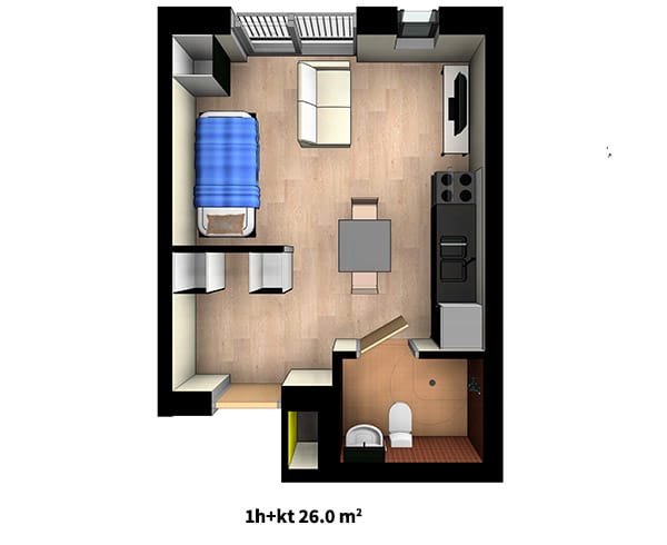 Yksiöissä on jääkaappipakastin, 4-levyinen liesi, mutta ei astianpesukonetta eikä varausta sille. Kaksioissa on jääpakastinkaappi, 4-levyinen liesi ja astianpesukone. Kotona/poissa-kytkin toimii huonesäätimestä ja ohjaa valaistusta, keittiön liettä sekä pistorasioita.